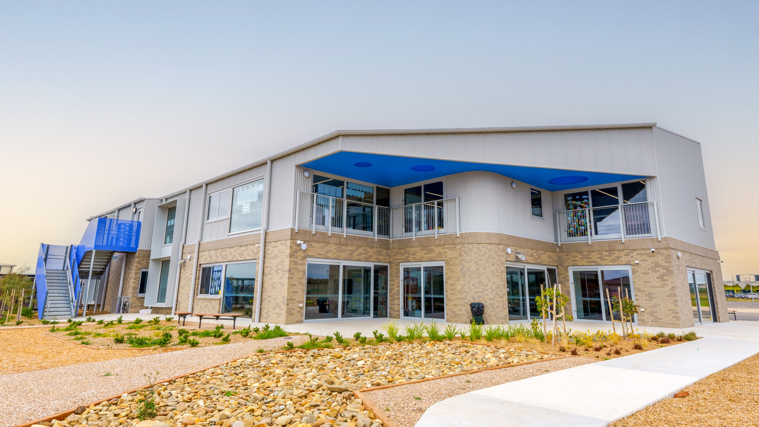 New two storey school building with administration, multiple classrooms, general learning areas and amenities. Plus external landscaping, playground and paving.